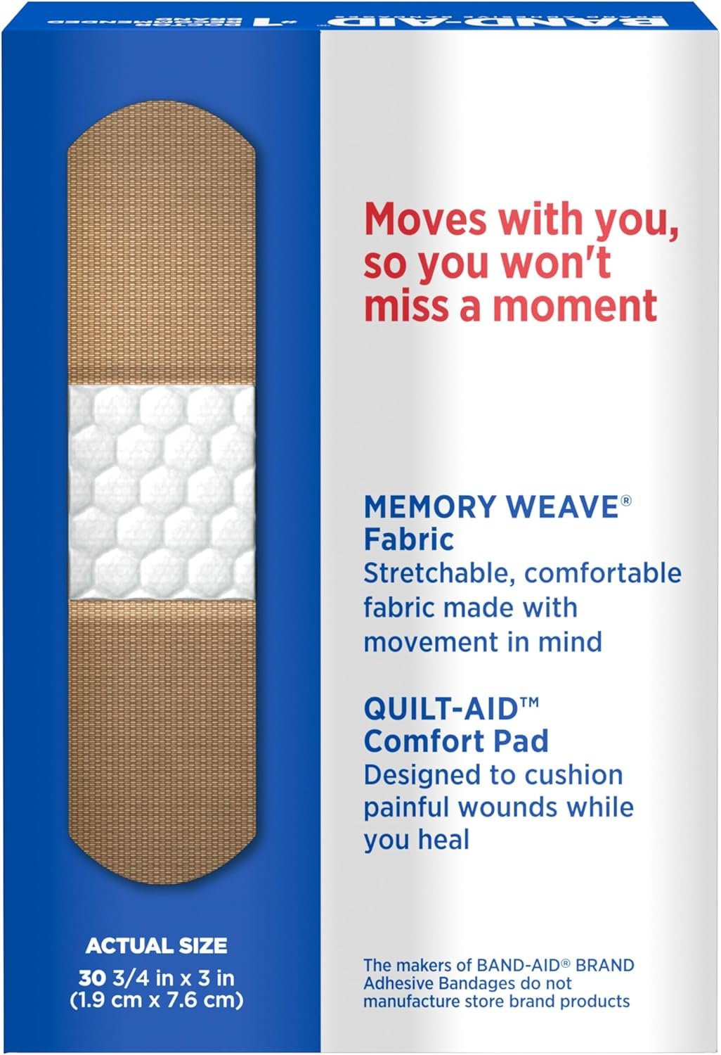 Band-Aid Brand Flexible Fabric Adhesive Bandages. Comfortable Flexible Protection & Wound Care of Minor Cuts & Scrapes. Quilt-Aid Technology to Cushion Painful Wounds. All One Size. 30 ct
